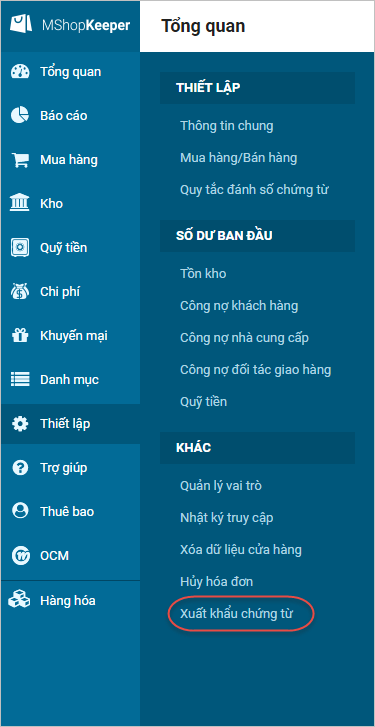 1. Tại phần Thiết lập, nhấn chọn Xuất khẩu chứng từ.