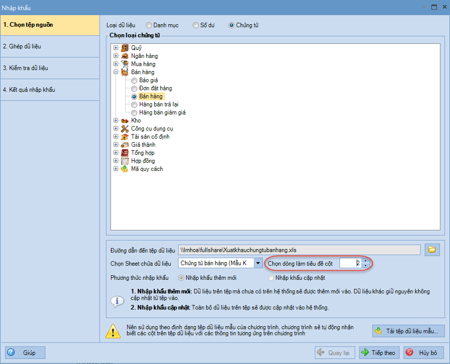 2. Khi nhập khẩu dữ liệu trên phần mềm SME, AMIS, chọn dòng làm tiêu đề cột là dòng thứ 2.